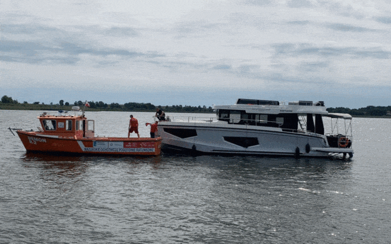 Kuter MOPR holował w poniedziałek od Starych Sadów do Giżycka tj. przez połowę Szlaku Wielkich Jezior Mazurskich trzy razy cięższego houseboata.